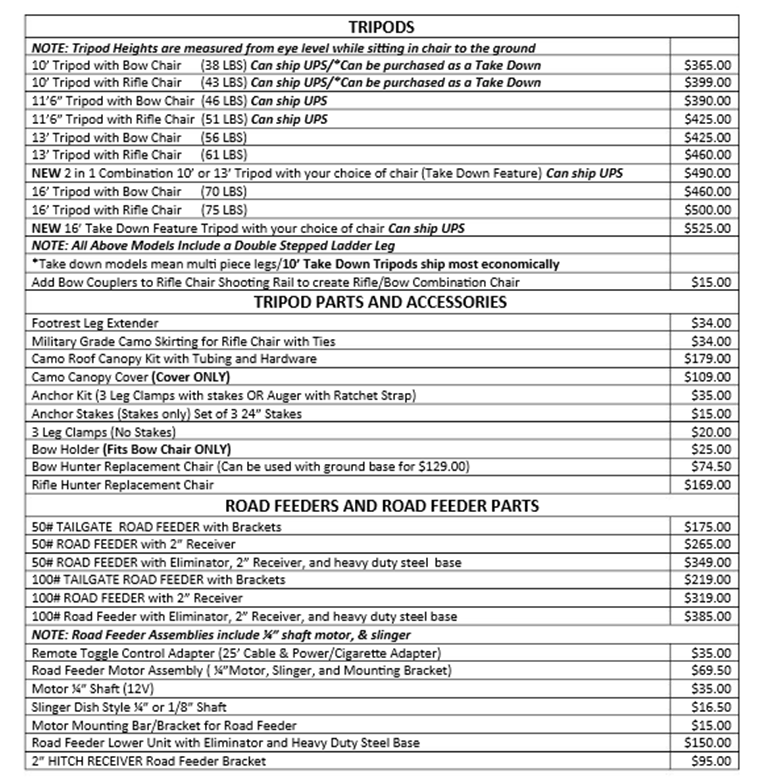 Home  I  Blinds  I   FeedersTripods  I   Products  I  Endorsements  I  Prices   I  Contact Us